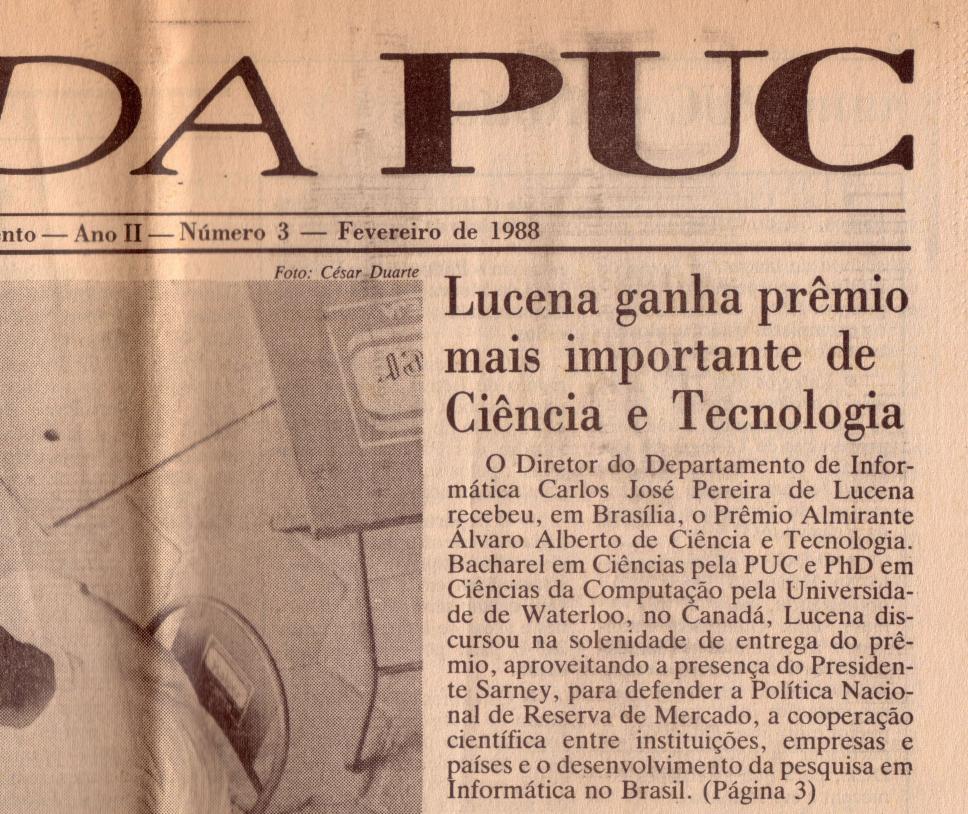 "Lucena ganha prêmio mais importante de Ciência e Tecnologia", Manchete da primeira página do Jornal da PUC sobre a entrega do prêmio Almirante Álvaro Alberto de Ciência e Tecnologia, em Brasília, ao Prof. Lucena.