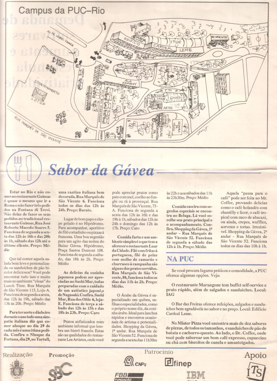 Página 4 do Boletim do VII Simpósio Brasileiro de Engenharia de Software, ocorrido na PUC-Rio, organizado pelo Departamento de Informática. Mapa do campus da PUC-Rio e indicações de locais de alimentação.