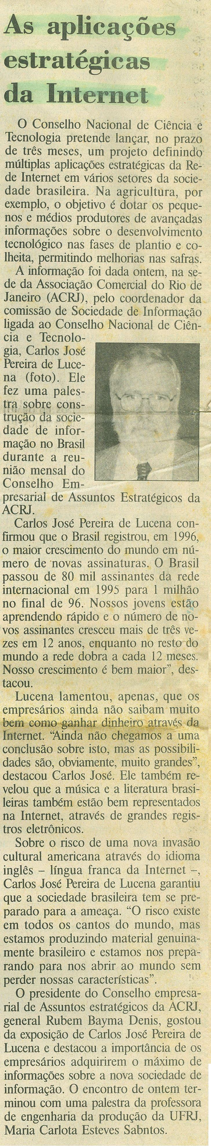 "As aplicações estratégicas da Internet", com depoimento do Prof. Carlos Lucena quando este era o coordenador da comissão de Sociedade de Informação do Conselho Nacional de Ciência e Tecnologia.