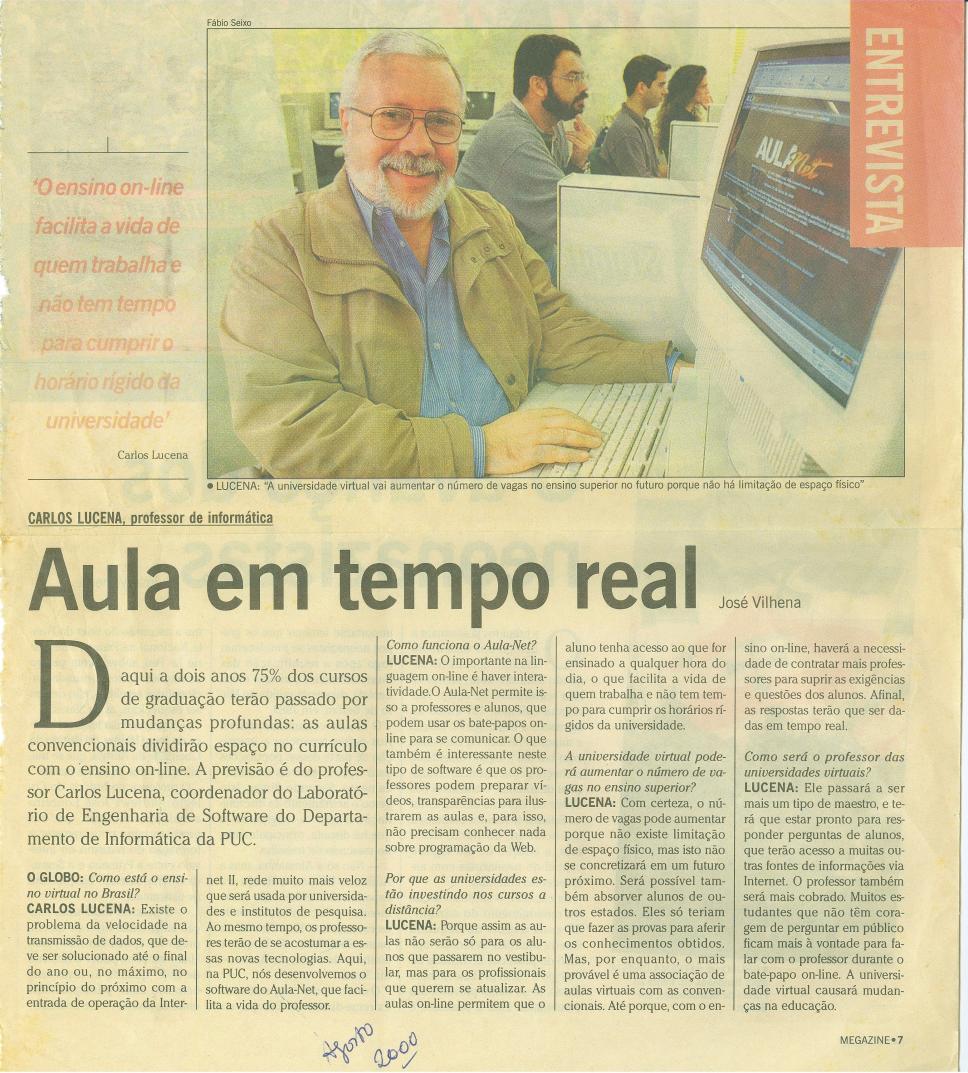 "Aula em tempo real", entrevista com o Prof. Carlos Lucena sobre a utilização da Internet em cursos a distância, através da ferramenta AulaNet.
