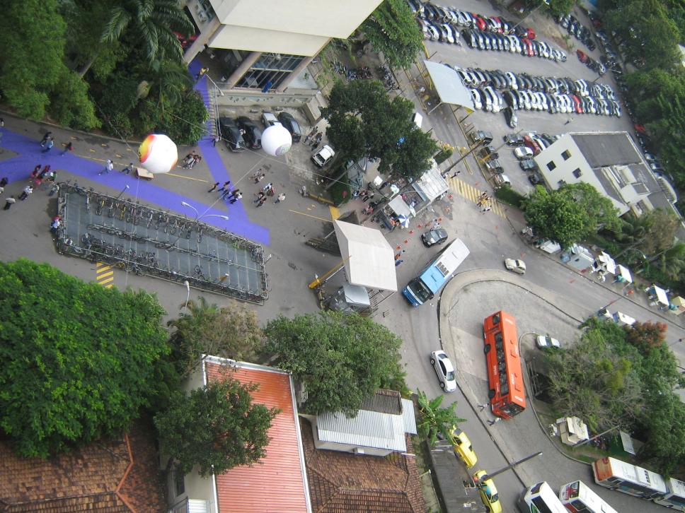 Vista do alto do Ed. Cardeal Leme. Entrada da PUC-Rio. Na pare superior da foto entrada da Ala Frings e estacionamento, no meio o bicicletário e porta de entrada e na parte inferior AFPUC e NIMA.