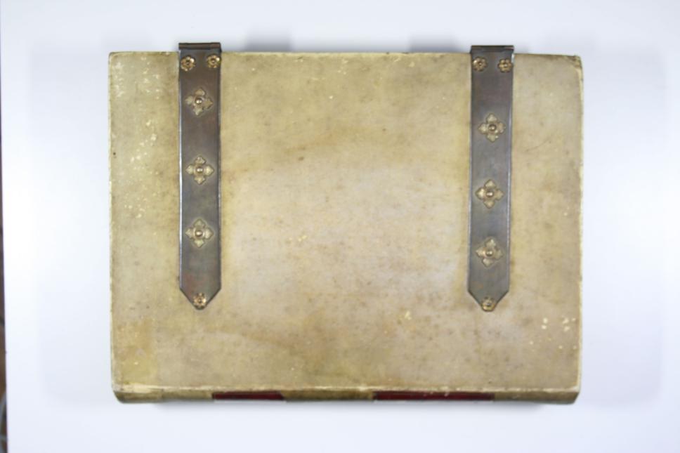 Foto da Edição Princeps da obra de Miguel de Cervantes Saavedra, El ingenioso hidalgo Don Qvixote de la Mancha, [1. ed.] Madrid: Iuan de la Cuesta, 1605-1615. 2 v. Capa de pergaminho, fecho de metal.