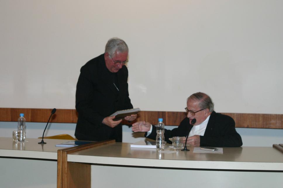 O Reitor Pe. Hortal S.J. oferece presentes relacionados à PUC-Rio a Dom Geraldo.