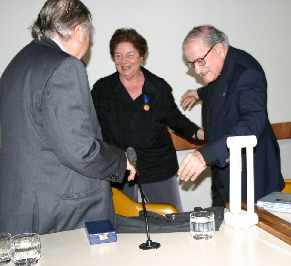 Cerimônia de entrega da Medalha Dom Helder Camara. A profa. Margarida de Souza Neves (HIS) cumprimenta o pe. Francisco Ivern S.J..