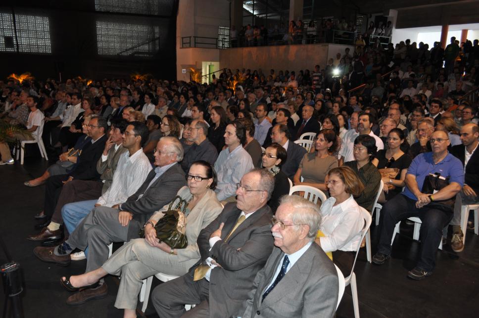 Movimentação antes da posse. Plateia com professores, funcionários, alunos e convidados.