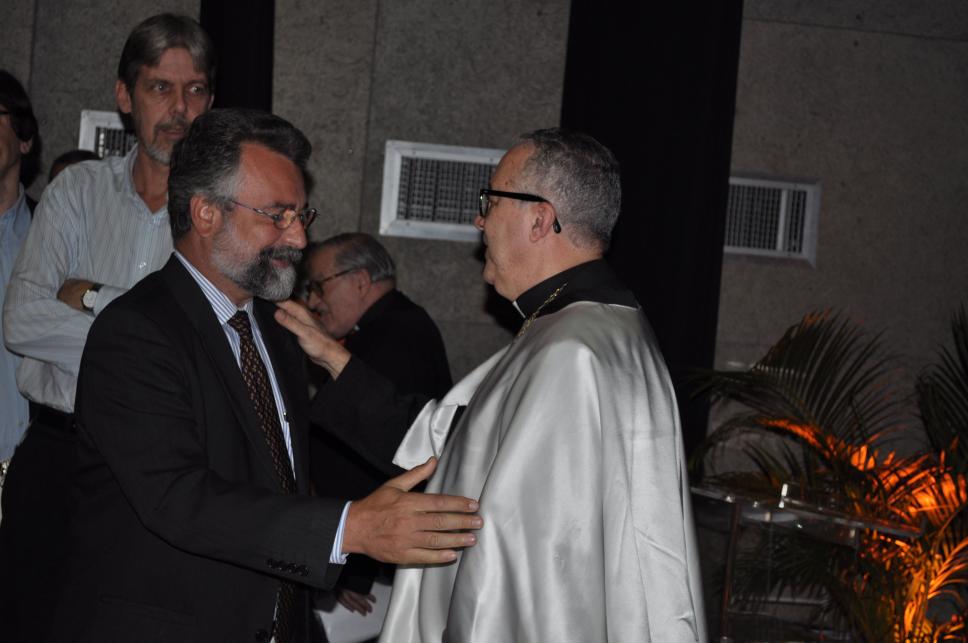 Confraternização após a cerimônia. Pe. Josafá cumprimenta o prof. Paulo Fernando Andrade.