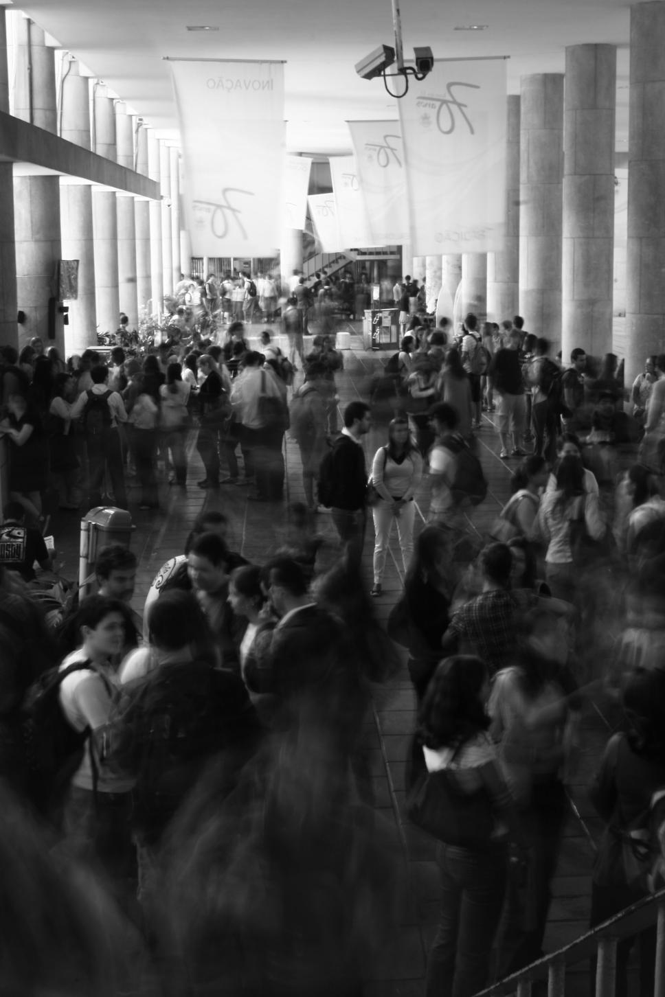 Pilotis cheio de pessoas, com banners comemorativos dos 70 anos da PUC-Rio.