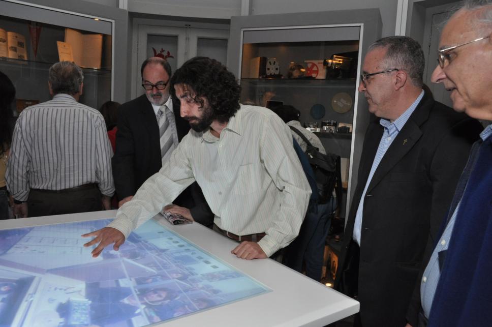 O Reitor Padre Josafá Carlos de Siqueira S.J. visita a exposição. Sala com as vitrines de cada Centro (CCBM, CCS, CTC e CTCH) da PUC-Rio, e mesa multitouch com exibição de imagens manipuláveis relacionadas aos Centros.