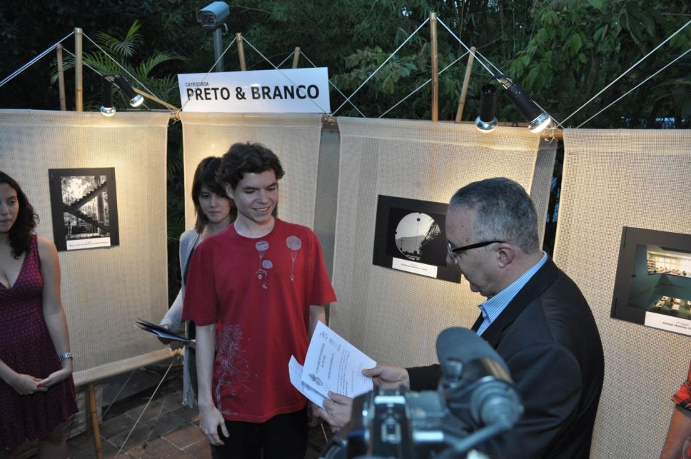 O Reitor Padre Josafá Carlos de Siqueira S.J. na exposição das fotos premiadas no Iº Concurso de Fotografia da PUC-Rio, na parte externa do Solar. Na foto os três primeiros colocados na categoria preto e branco.