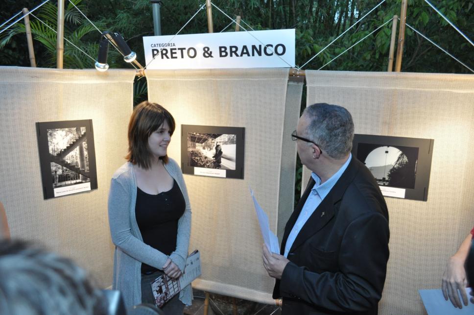 O Reitor Padre Josafá Carlos de Siqueira S.J. na exposição das fotos premiadas no Iº Concurso de Fotografia da PUC-Rio, na parte externa do Solar.