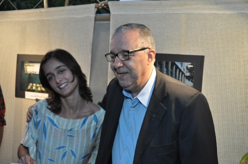 O Reitor Padre Josafá Carlos de Siqueira S.J. na exposição das fotos premiadas no Iº Concurso de Fotografia da PUC-Rio, na parte externa do Solar. Entrega dos certificados aos premiados.