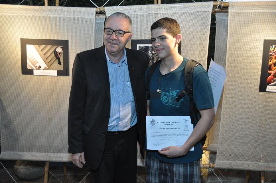 O Reitor Padre Josafá Carlos de Siqueira S.J. na exposição das fotos premiadas no Iº Concurso de Fotografia da PUC-Rio, na parte externa do Solar. Entrega dos certificados aos premiados.