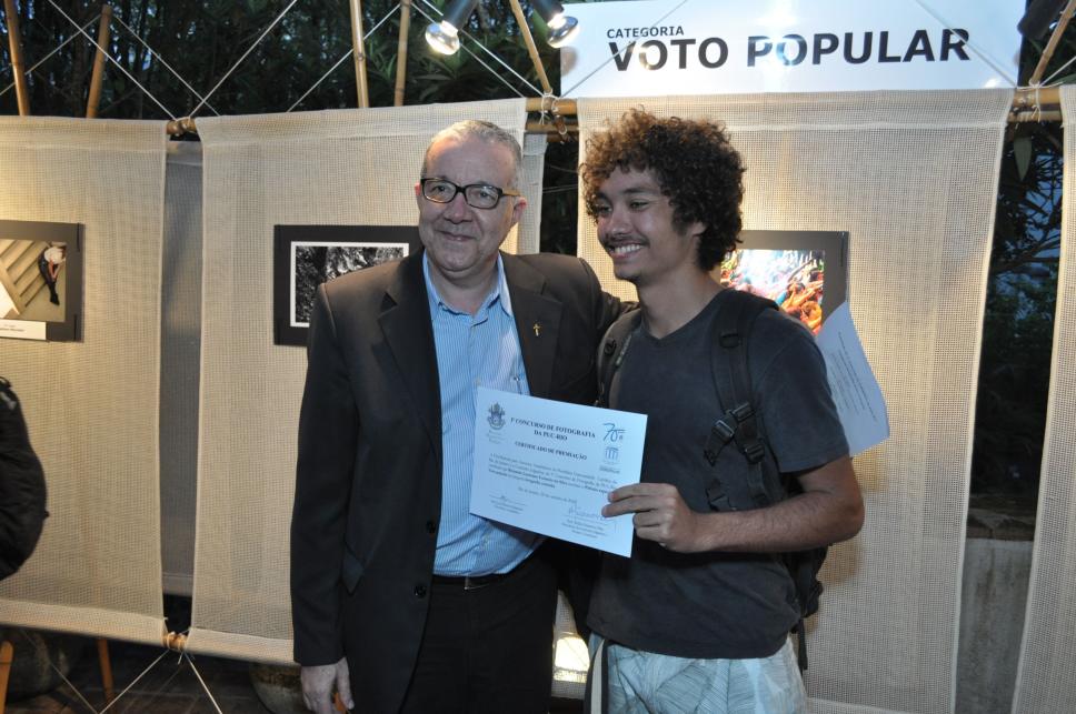 O Reitor Padre Josafá Carlos de Siqueira S.J. na exposição das fotos premiadas no Iº Concurso de Fotografia da PUC-Rio, na parte externa do Solar. Entrega dos certificados aos premiados.