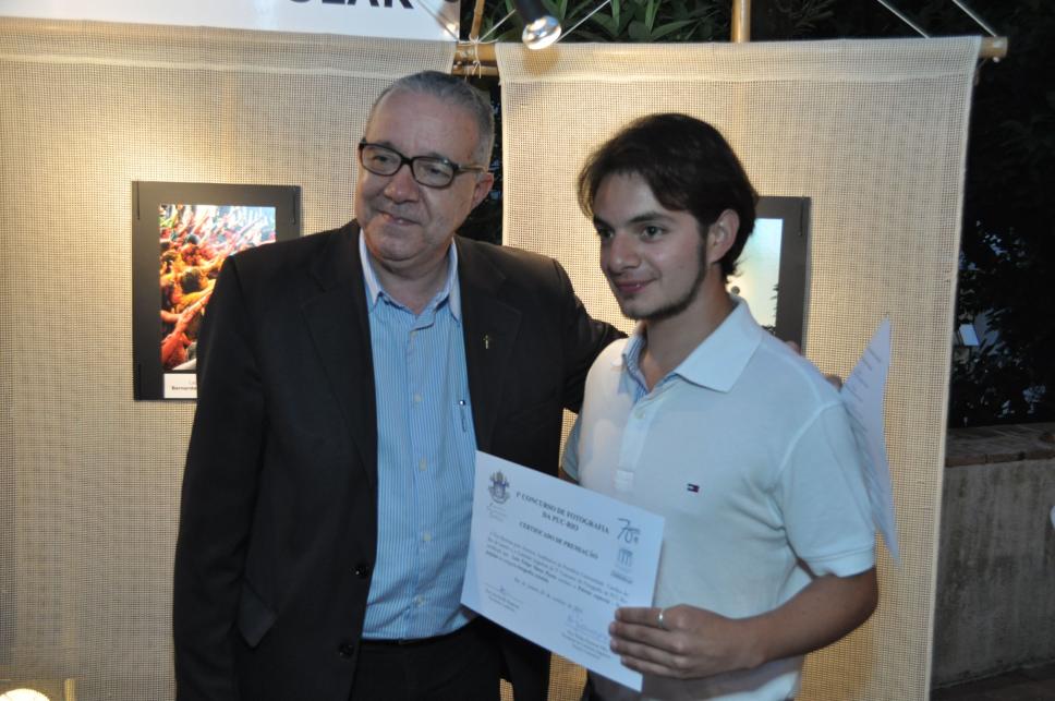 O Reitor Padre Josafá Carlos de Siqueira S.J. na exposição das fotos premiadas no Iº Concurso de Fotografia da PUC-Rio, na parte externa do Solar. Entrega dos certificados aos premiados.