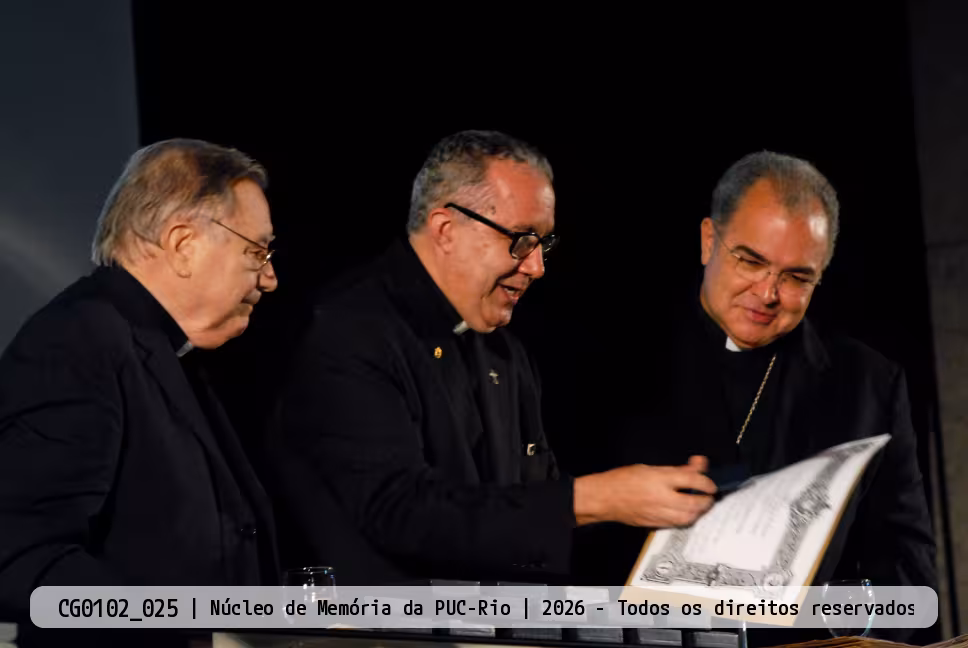O Reitor Padre Josafá Carlos de Siqueira S.J. dá início a entrega das medalhas comemorativas dos 70 anos da PUC-Rio.