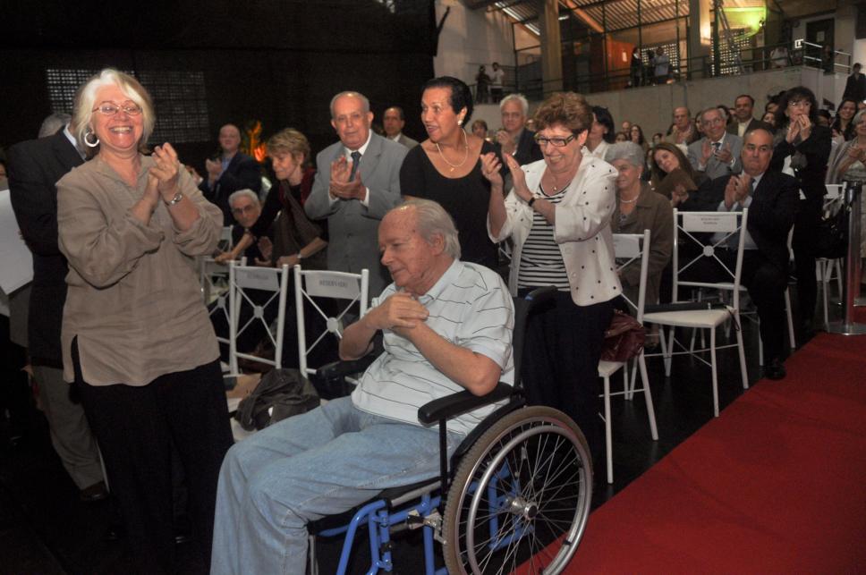 O Professor Leandro Konder, do Departamento de Educação, no momento em que foi homenageado com a medalha comemorativa aos 70 anos da PUC-Rio