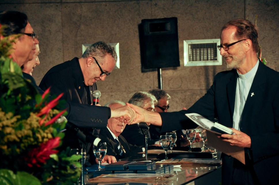 O Professor Padre Paul Schweitzer S.J., do Departamento de Matemática, homenageado com o diploma e a medalha comemorativos aos 70 anos da PUC-Rio.