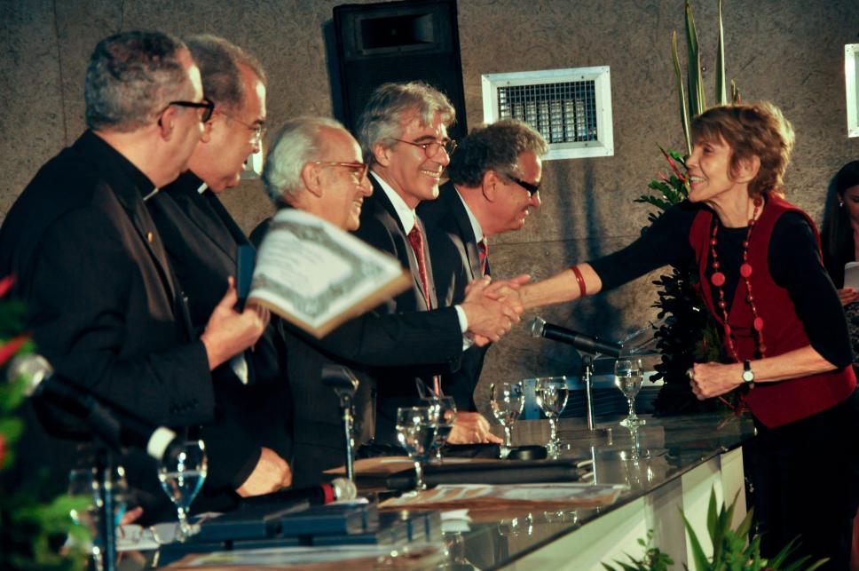 A professora Sonia de Camargo, do Instituto de Relações Internacionais da PUC-Rio, recebe o diploma e a medalha comemorativos aos 70 anos da PUC-Rio.