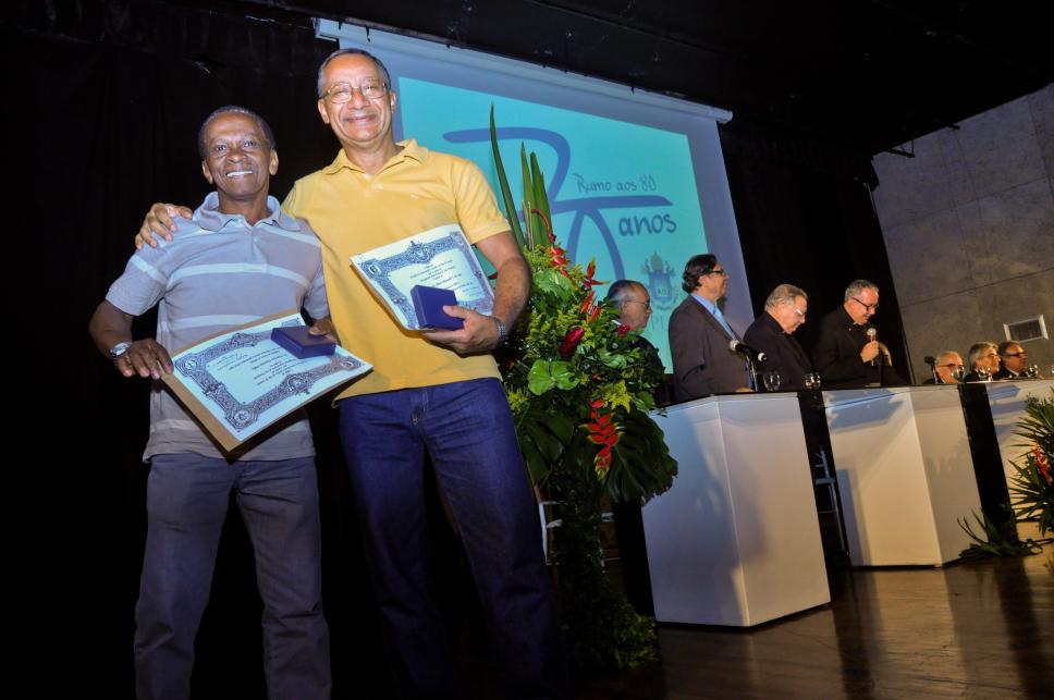 Os funcionários Francisco Faustino Filho e Charles Albert Renault de Lima recebem o diploma e a medalha comemorativos aos 70 anos da PUC-Rio.