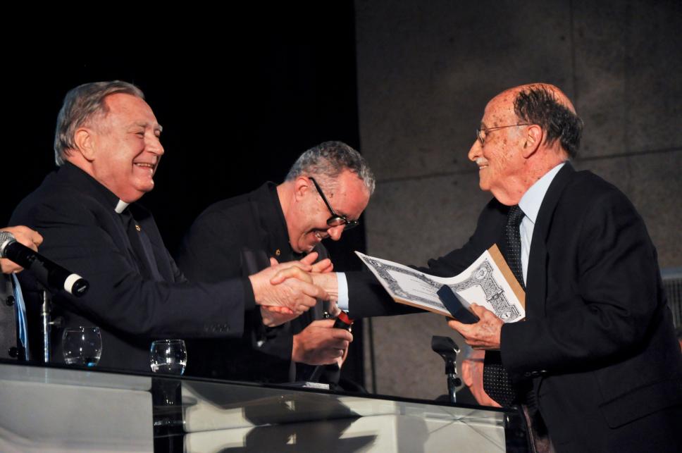 O professor José Raimundo Martins Romêo, membro do Conselho de Desenvolvimento da PUC-Rio, recebe o diploma e a medalha comemorativos aos 70 anos da PUC-Rio.