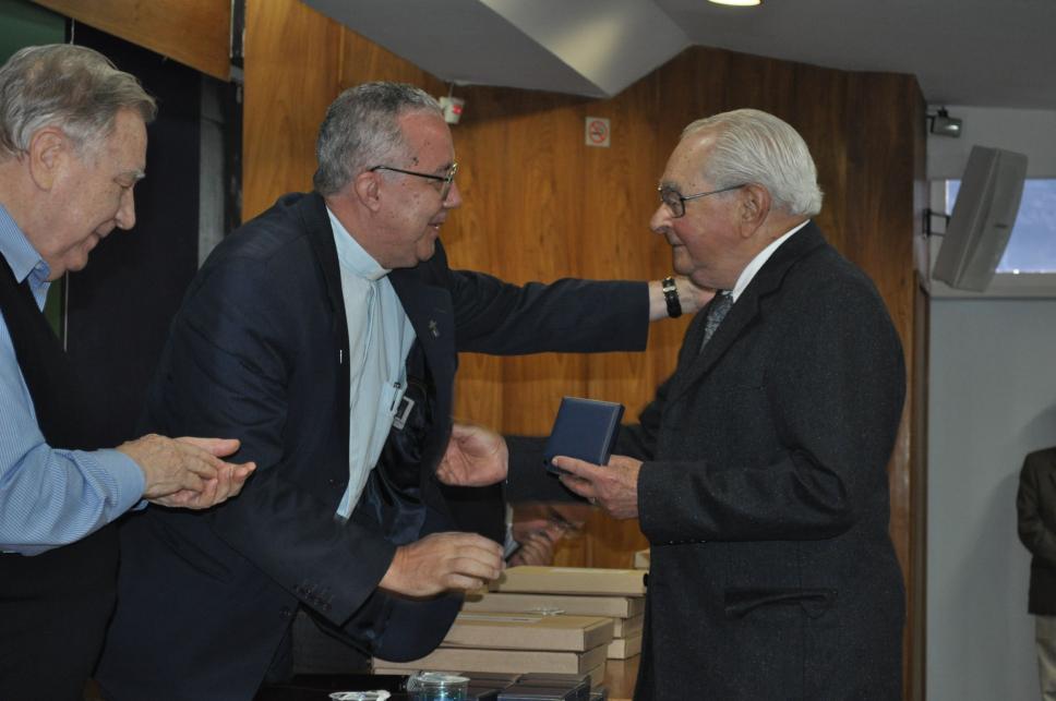 O Prof. José Arthur Borges Cabral, do Departamento de Engenharia Elétrica, recebe a medalha comemorativa aos 70 anos da PUC-Rio.