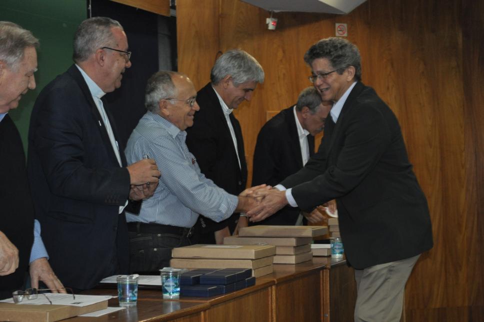 O Prof. Geovan Tavares dos Santos, do Departamento de Matemática, recebe a medalha comemorativa aos 70 anos da PUC-Rio.