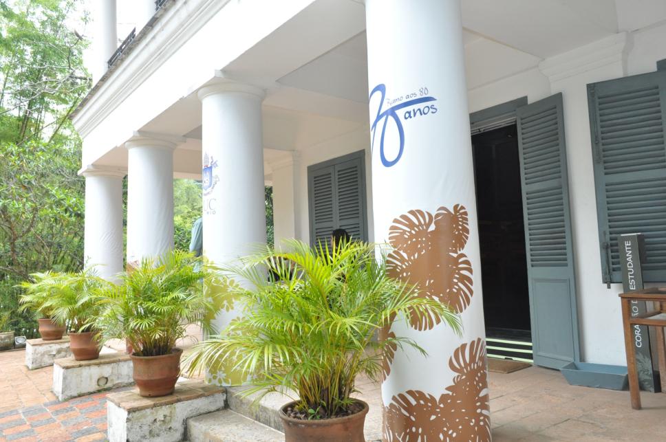 Fachada, colunas e varanda inferior do Solar Grandjean de Montigny, com a entrada da Exposição.