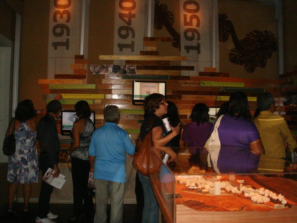 Visita de professores do Norte e Nordeste formados em História no curso de Educação à Distância da PUC-Rio à Exposição PUC-Rio 70 anos. Sala No Tempo, com a maquete do campus Gávea.