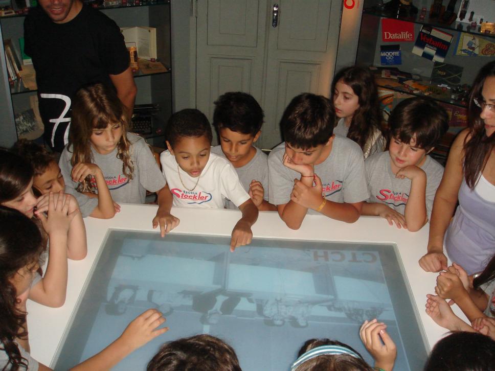 Sala Ícones, mesa interativa com fotos relativas aos quatro centros que compõem a PUC-Rio. Visita de alunos de escolas da Gávea. Exposição PUC-Rio 70 anos, Rumo aos 80.