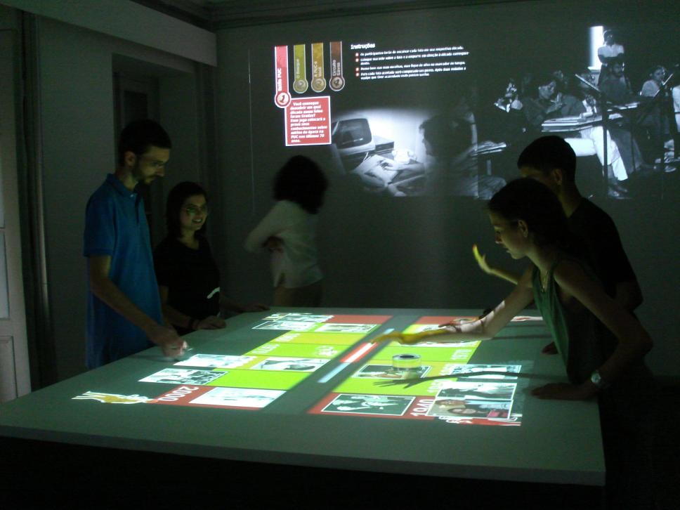 Sala Jogos da Memória, com mesa interativa onde ocorriam diversos jogos relacionados a PUC-Rio e seu entorno. Exposição PUC-Rio 70 anos, Rumo aos 80.