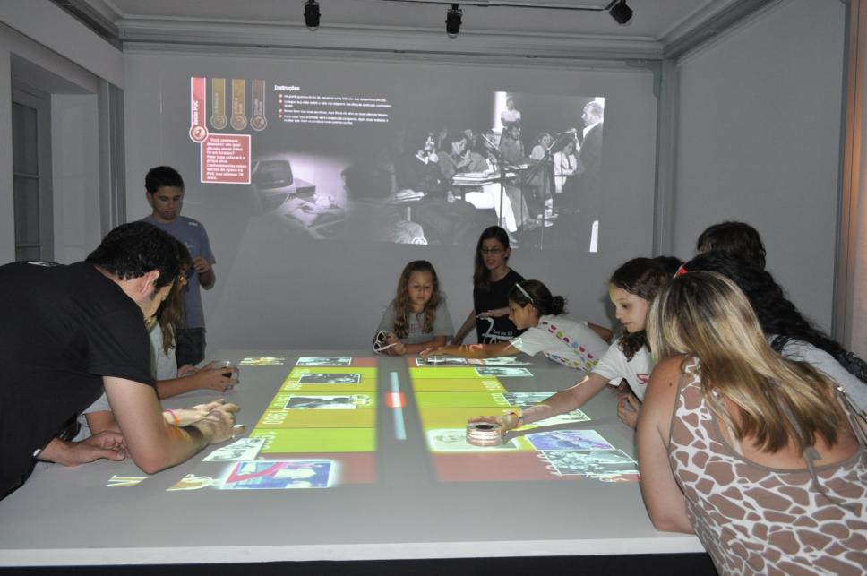 Sala Jogos da Memória, com mesa interativa onde ocorriam diversos jogos relacionados a PUC-Rio e seu entorno. Exposição PUC-Rio 70 anos, Rumo aos 80.