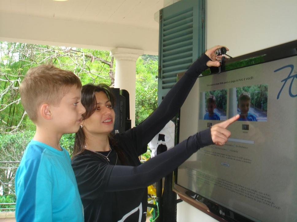 Varanda do segundo andar, onde havia câmeras para registro de fotos e depoimentos dos visitantes. Exposição PUC-Rio 70 anos, Rumo aos 80.