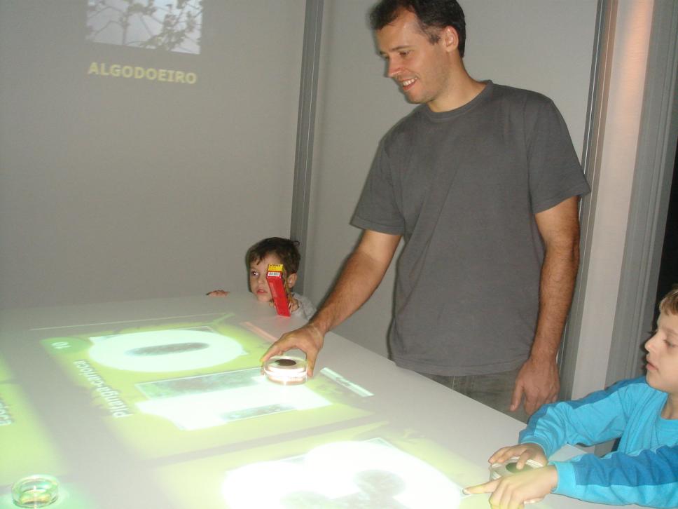 Sala Jogos da Memória, com mesa interativa onde ocorriam diversos jogos relacionados a PUC-Rio e seu entorno.