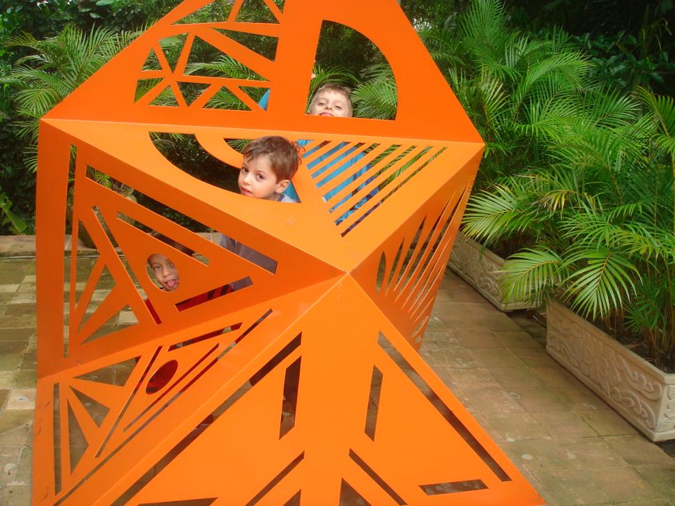 Crianças em visita a Exposição PUC-Rio 70 anos interagem com escultura no pátio do Solar.