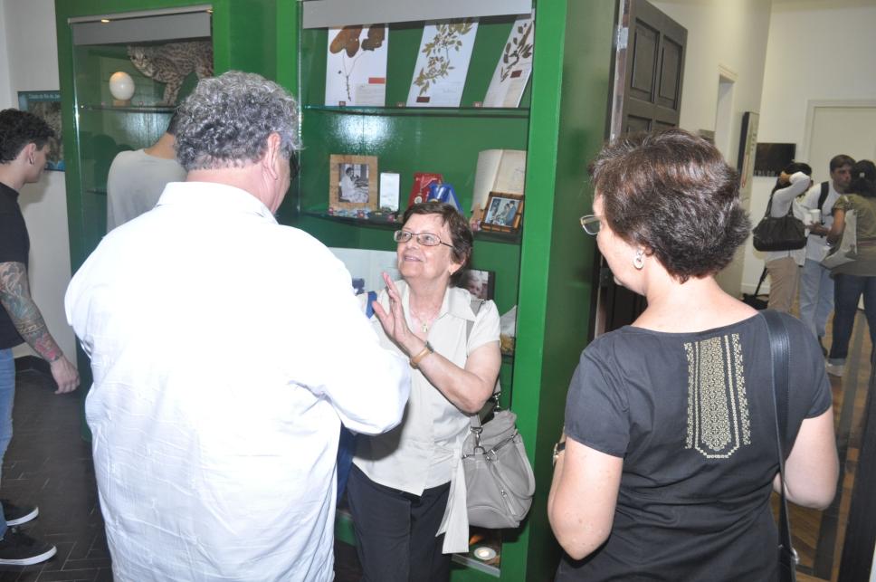 Confraternização após a cerimônia de inauguração da sede do curso de Ciências Biológicas da PUC-Rio. Ao fundo estantes da exposição ´Da natureza às ciências da vida´.