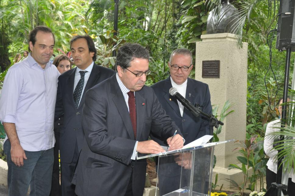Cerimônia de inauguração do busto do Padre Antônio Vieira. Assinatura de documentos relativos a instalação do busto no campus da PUC-Rio.