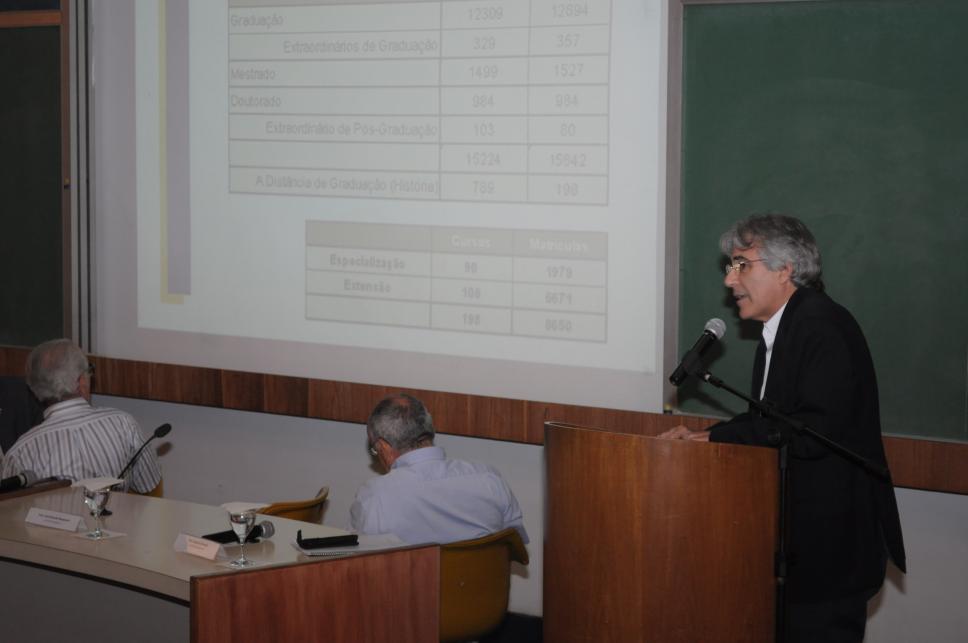O Vice-Reitor Acadêmico, prof. Bergmann, apresenta o relatório anual da vice-reitoria Acadêmica aos membros da congregação universitária.