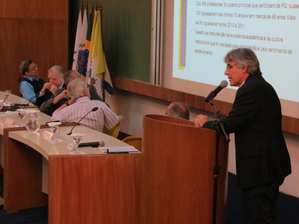O Vice-Reitor Acadêmico, prof. Bergmann, apresenta o relatório anual da vice-reitoria Acadêmica aos membros da congregação universitária.