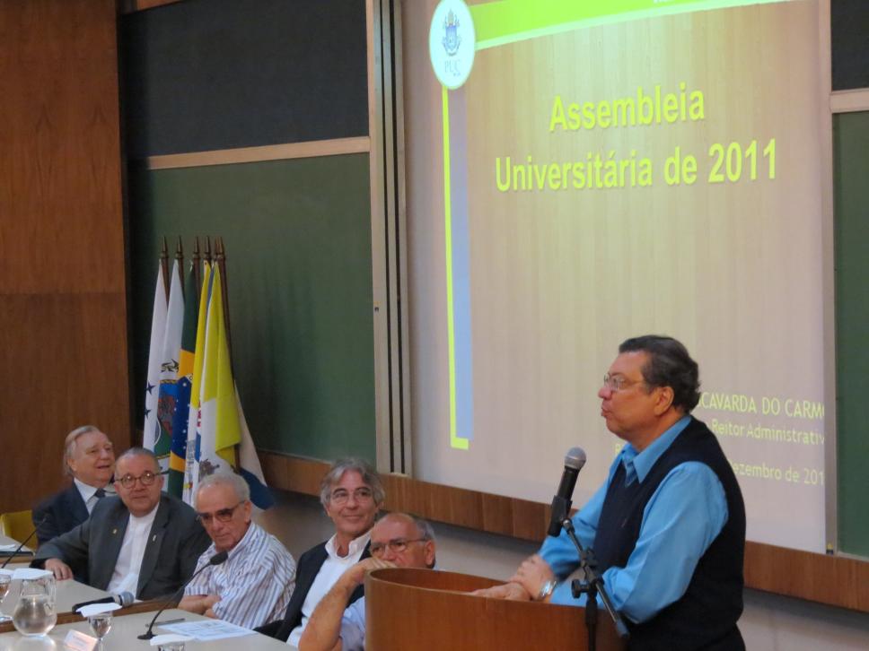 O Vice-Reitor Administrativo, prof. Scavarda, apresenta o relatório anual da vice-reitoria Administrativa aos membros da congregação universitária.