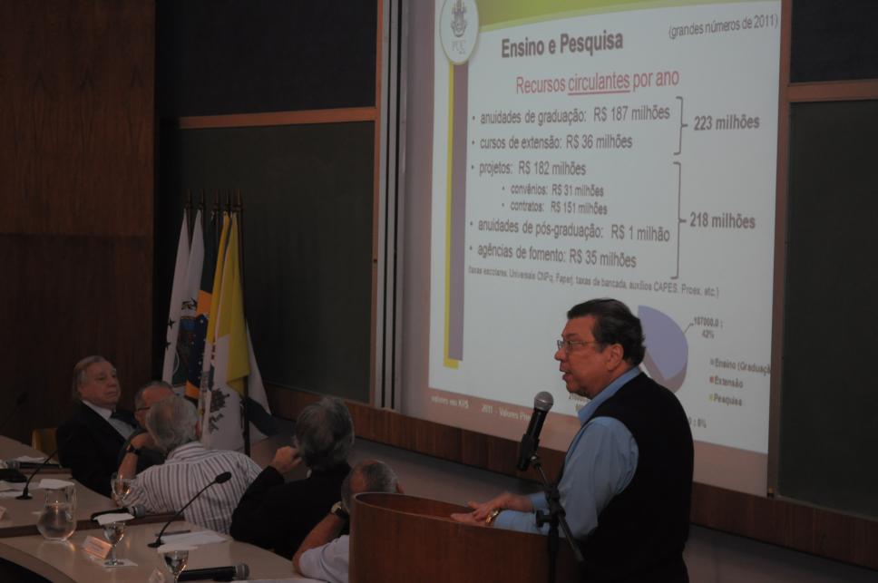 O Vice-Reitor Administrativo, prof. Scavarda, apresenta o relatório anual da vice-reitoria Administrativa aos membros da congregação universitária.