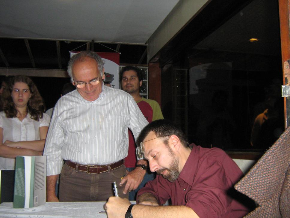 O prof. Adriano Pilatti autografa seu livro para o prof. Augusto Sampaio.
