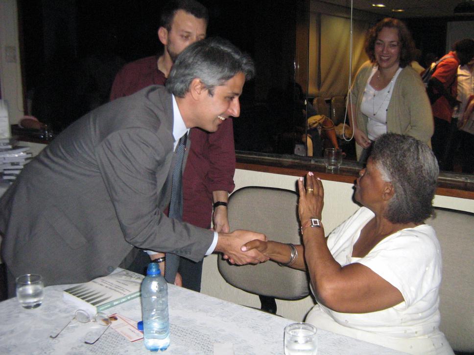 O prof. Adriano Pilatti e o prof. Alessandro Molon confraternizam com representante do Jongo da Serrinha.