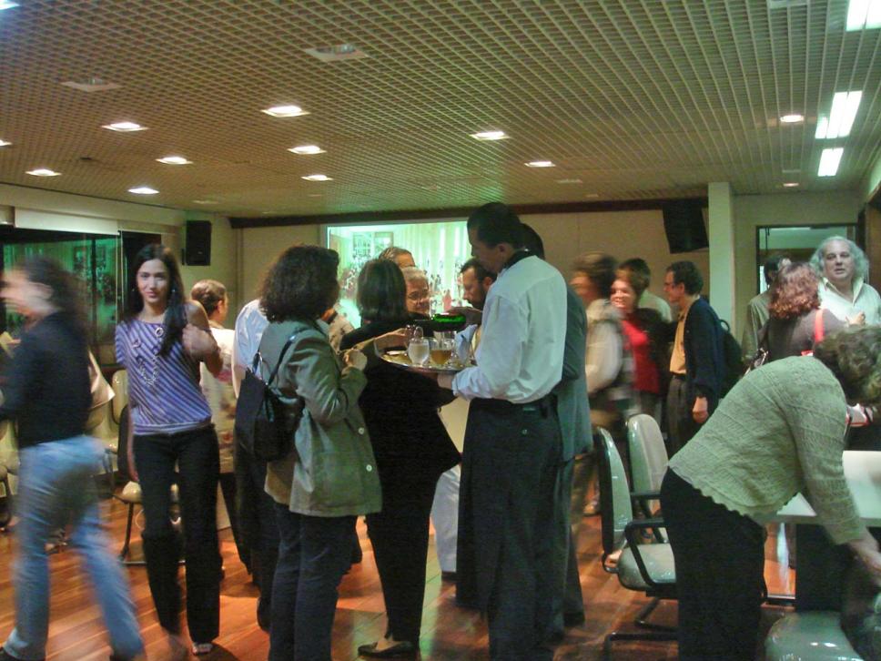 Professores e funcionários veem as fotos do acervo do Núcleo de Memória exibidas em telão.