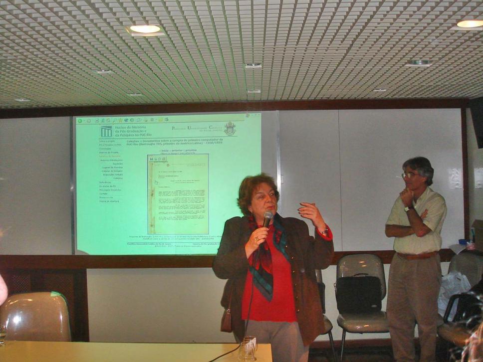 A Profa. Margarida de Souza Neves apresenta o site do Núcleo de Memória, exibido na tela ao fundo.