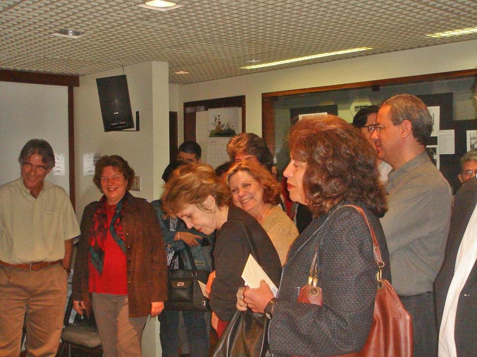 Professores e funcionários veem as fotos do acervo do Núcleo de Memória exibidas em telão.
