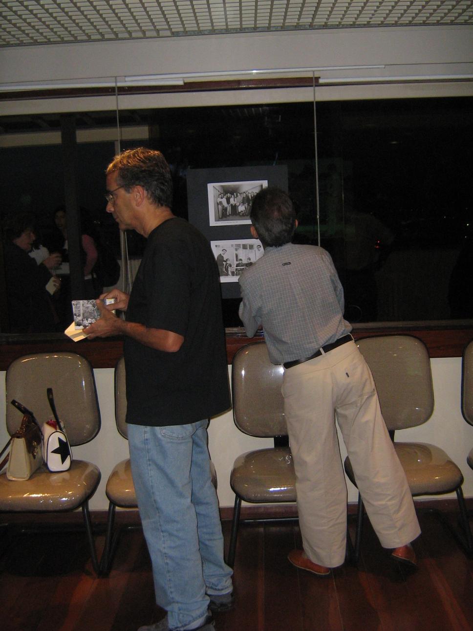 Professores e funcionários veem as fotos do acervo do Núcleo de Memória colocadas em paineis para identificação.