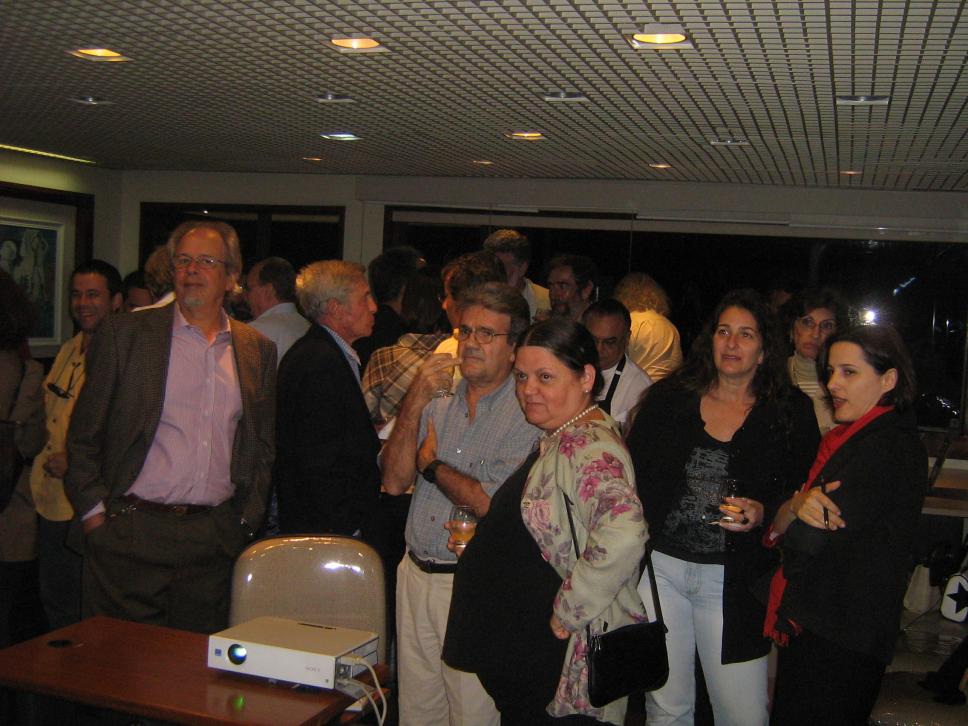 Professores e funcionários veem as fotos do acervo do Núcleo de Memória exibidas em telão.