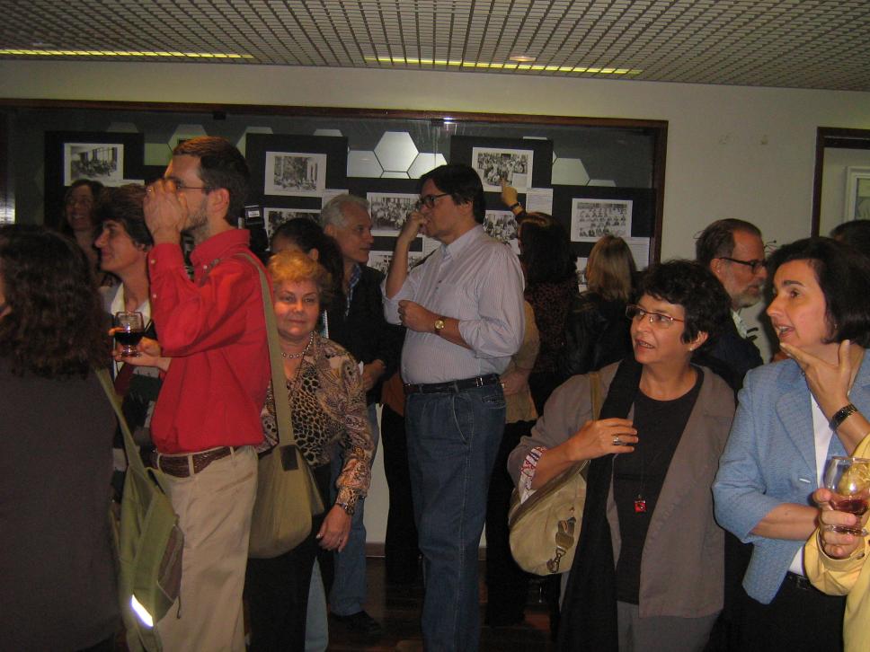 Professores e funcionários veem as fotos do acervo do Núcleo de Memória no telão, enquanto outros identificam as colocadas nos painéis.