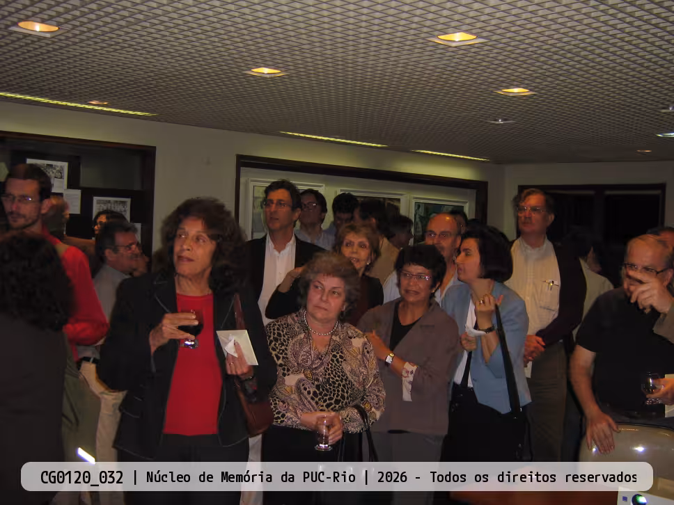 Professores e funcionários veem as fotos do acervo do Núcleo de Memória exibidas em telão.