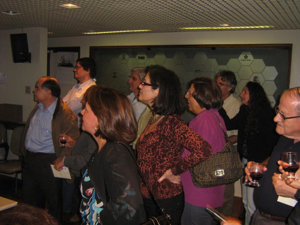 Professores e funcionários veem as fotos do acervo do Núcleo de Memória exibidas em telão.